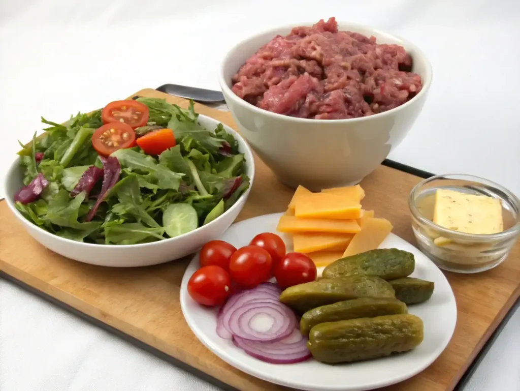 - Arrange tomatoes, onions, and pickles in separate sections around the beef