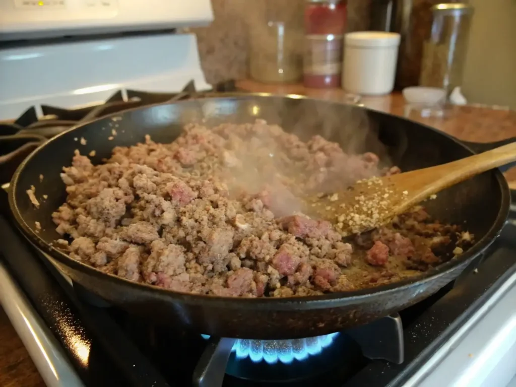 - Remove ground beef from refrigerator 30 minutes before cookingCombine seasonings in a small bowl: mix salt, pepper, garlic powder, and onion powderGently work seasonings into the meat, avoiding overworkingHeat your skillet over medium-high heat until a drop of water sizzlesBreak the meat into loose portions before adding to the panCook ground beef in a single layer, breaking into crumblesContinue cooking until meat reaches 160°F (about 8-10 minutes)Drain excess fat if desired, leaving some for flavor