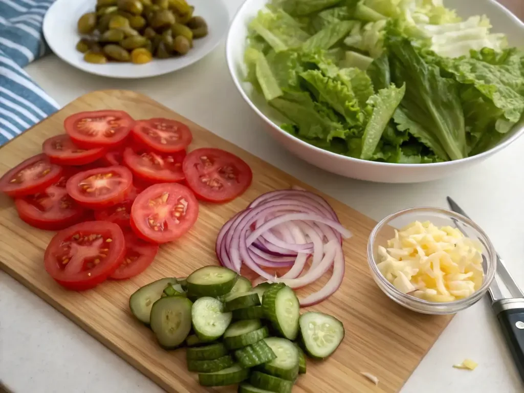 - Wash and thoroughly dry all fresh vegetablesSlice cherry tomatoes in halfCut red onion into thin rings or half-moonsDice pickles into bite-sized piecesShred or slice cheese if not pre-shreddedTear lettuce into bite-sized pieces if needed