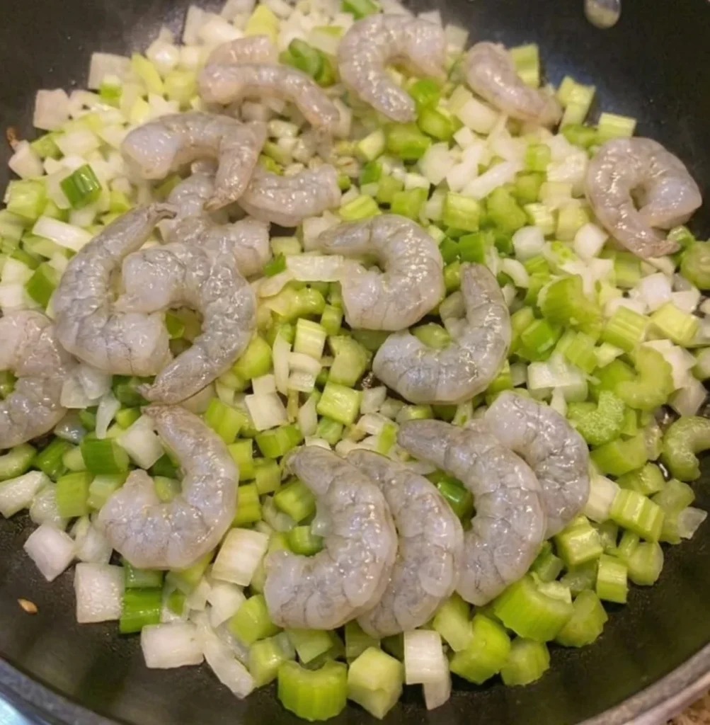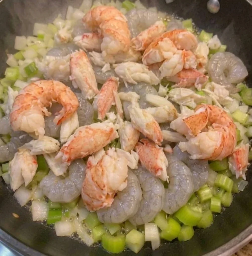 • Add shrimp, crab, and crawfish directly into the softened vegetable mix.