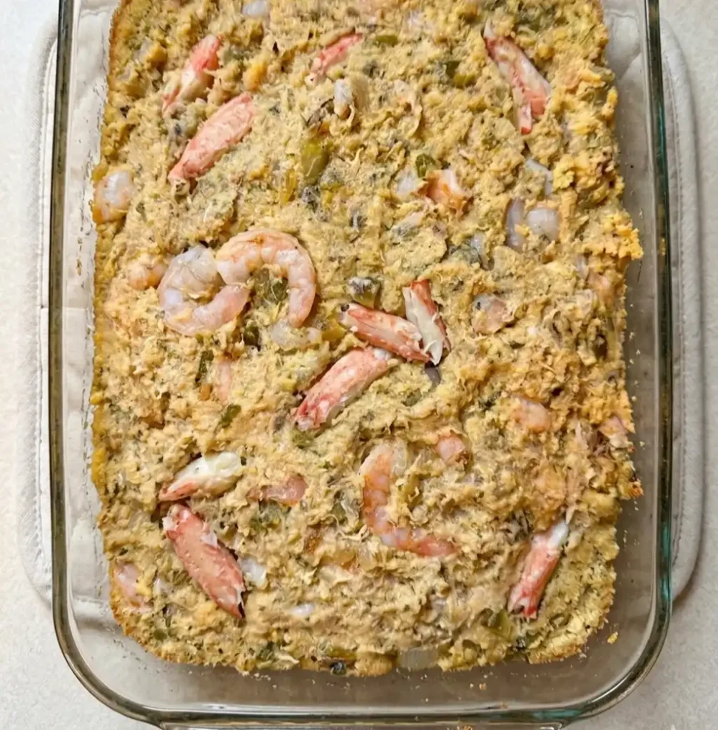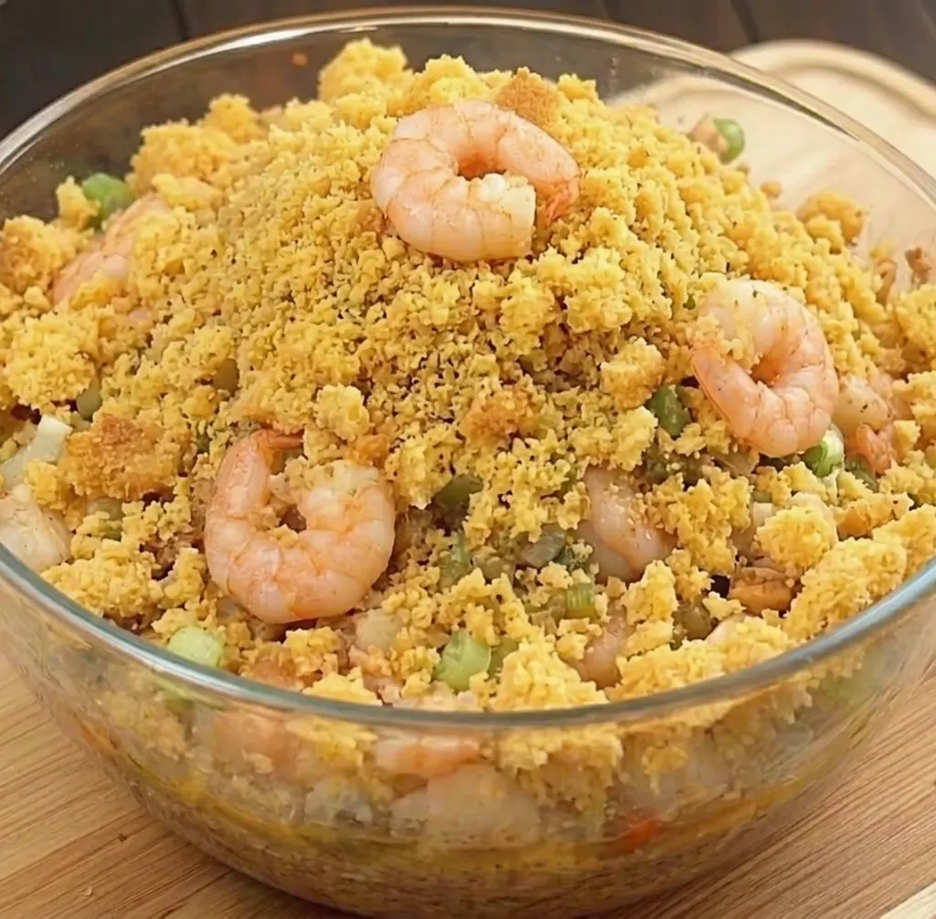 It’s a variation of dressing made primarily with shrimp, cornbread, and spices—simple yet flavorful.