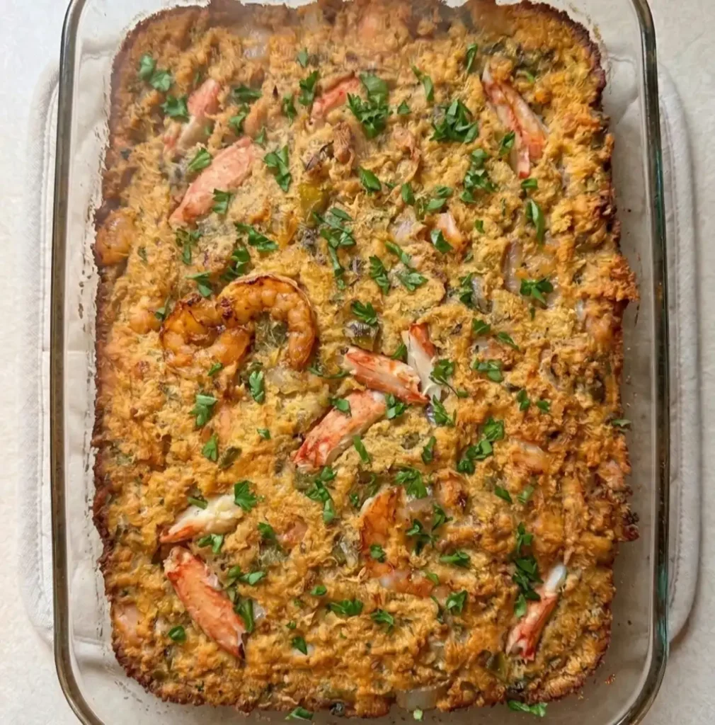Sunday dinners hit different. homemade Cajun seafood dressing is a bold and flavorful Southern classic inspired by the rich culinary traditions of Louisiana. Made with shrimp, crab, and a blend of aromatic vegetables and Cajun spices, this dish delivers a perfect balance of heat and savory depth. It’s especially popular during holidays and family gatherings, where its comforting texture and spicy kick make it stand out from traditional dressing recipes.