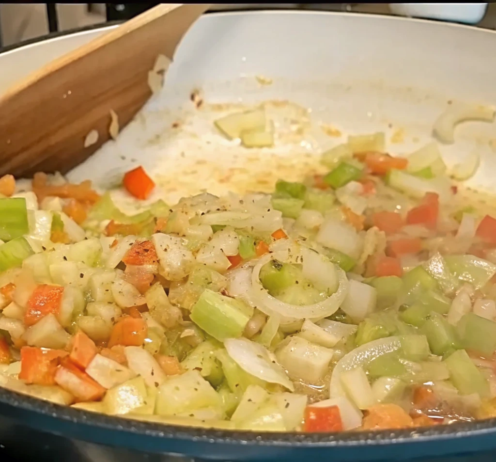 Cook until fragrant and soft, about five minutes. The kitchen begins to smell amazing — savory, buttery, slightly sweet. And here was the surprise: these humble vegetables form the backbone of Cornbread Seafood Dressing.