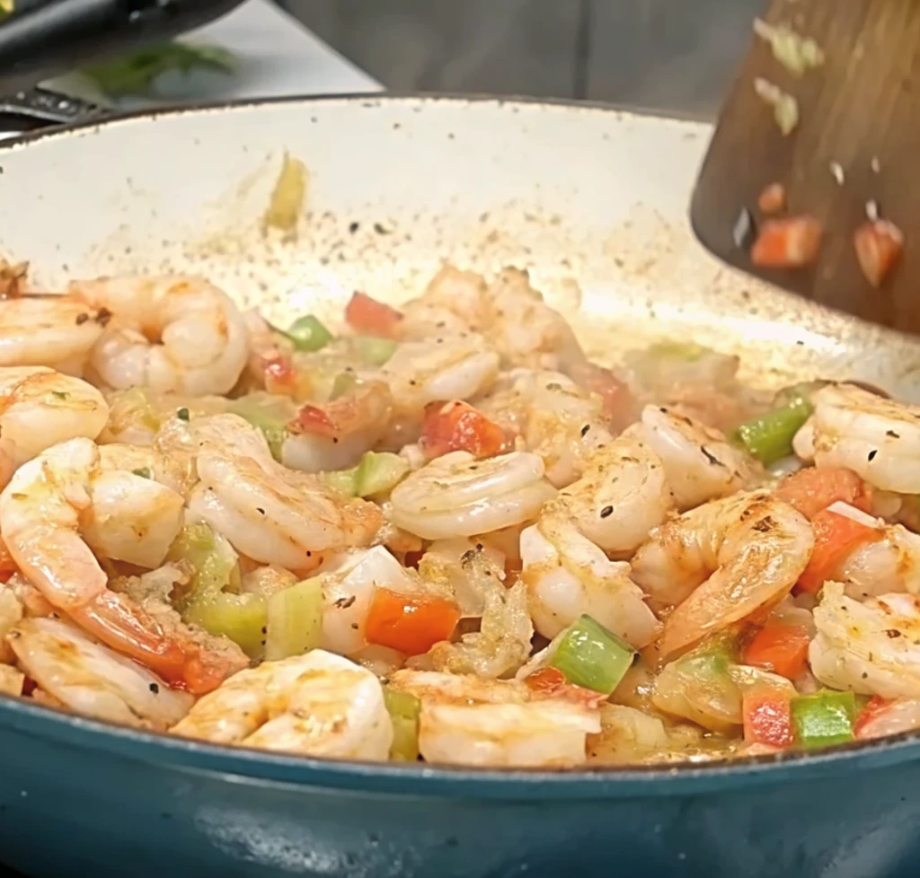 Seafood cooks fast. Really fast. Add the chopped shrimp to the warm skillet and cook for about two minutes. Just until they turn pink. That’s enough. Overcooking makes seafood rubbery, and nobody wants that.