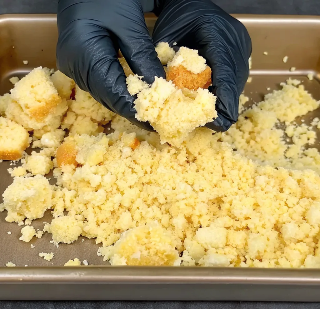 Start simple. Really simple. Crumble the cornbread into a large mixing bowl. Don’t overthink it — uneven pieces actually make better texture later. Some crumbs soak up broth quickly while larger chunks stay fluffy, which is exactly what seafood dressing with cornbread needs.